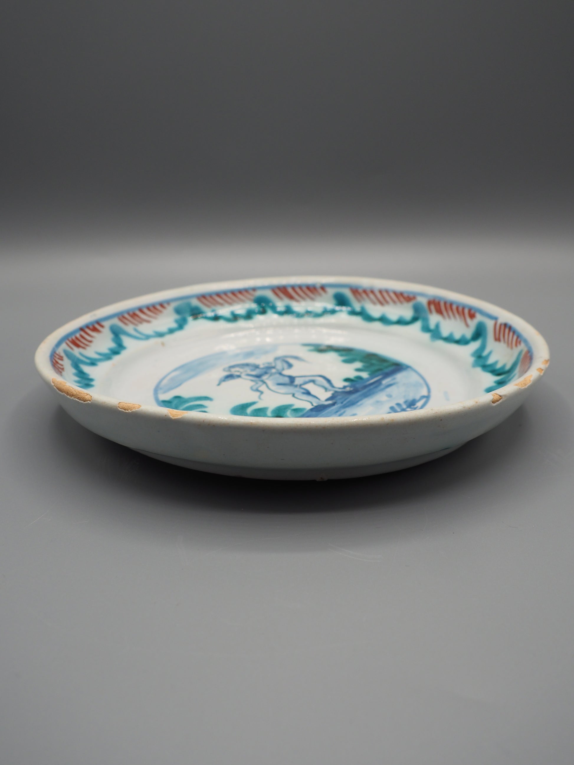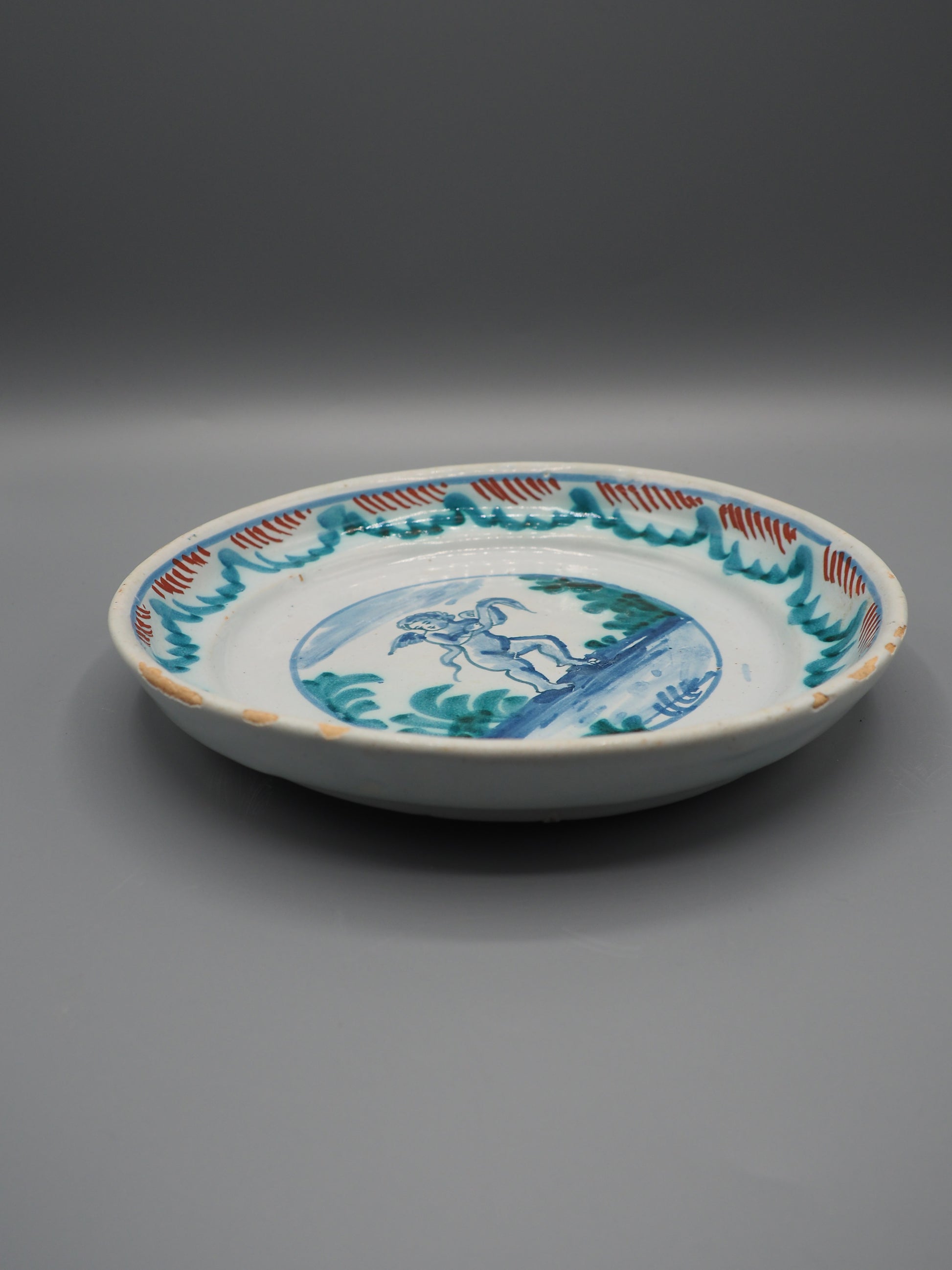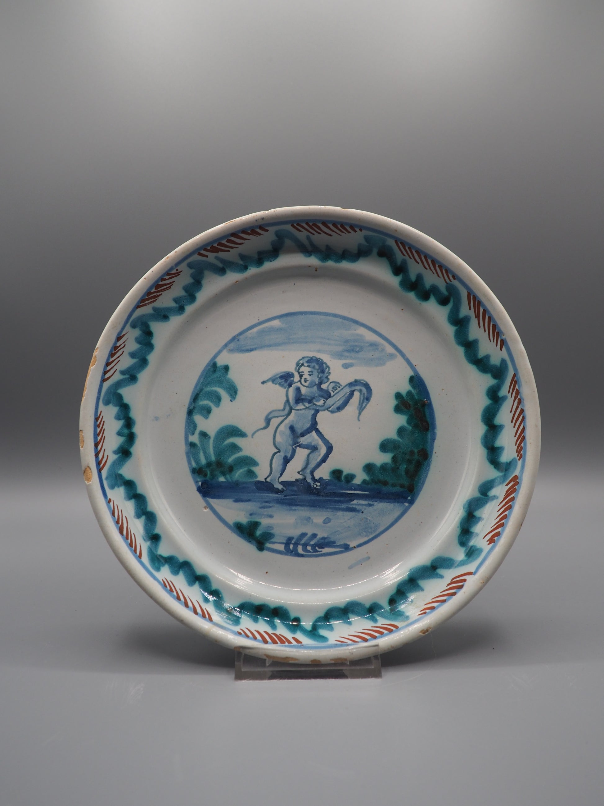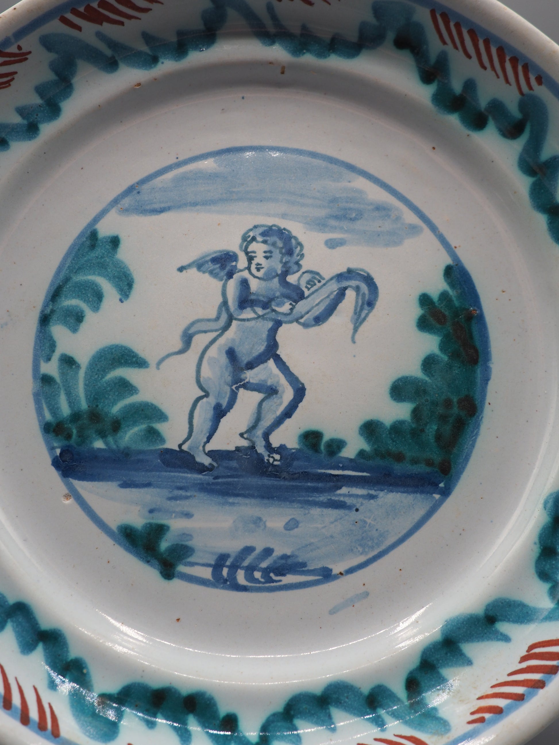 Bring a touch of 18th-century charm into your home with this beautiful French faience dish, delicately hand-painted with a lively putto (cherub) scene in soft blue, turquoise and terracotta tones. A wonderful example of early European tin-glazed pottery, full of character and artistry.