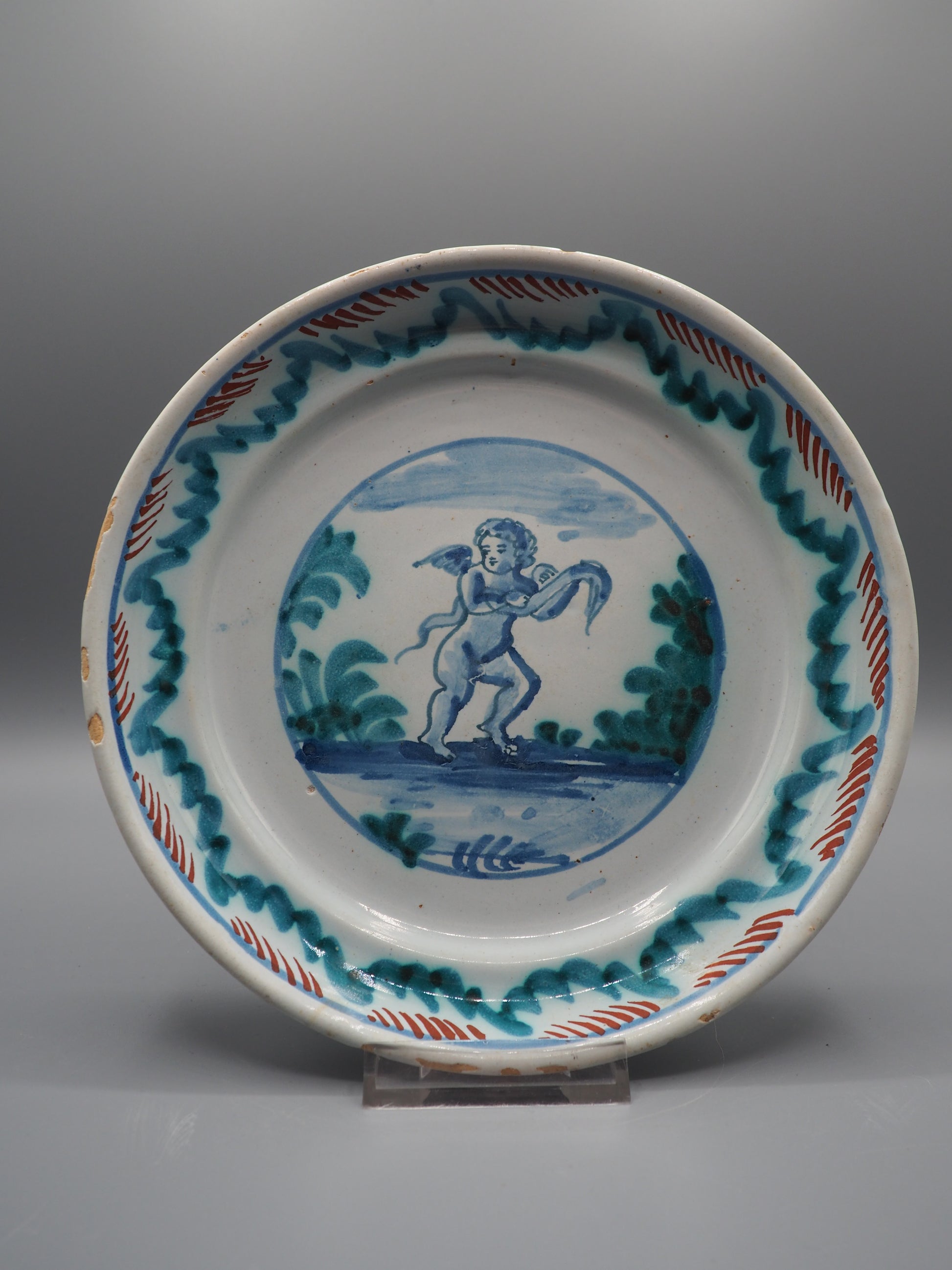 This charming dish features a central putto standing in a landscape, executed in traditional blue camaïeu style with green foliage accents. The rim is decorated with a classic 18th-century scroll and feather border, typical of French provincial faience workshops.