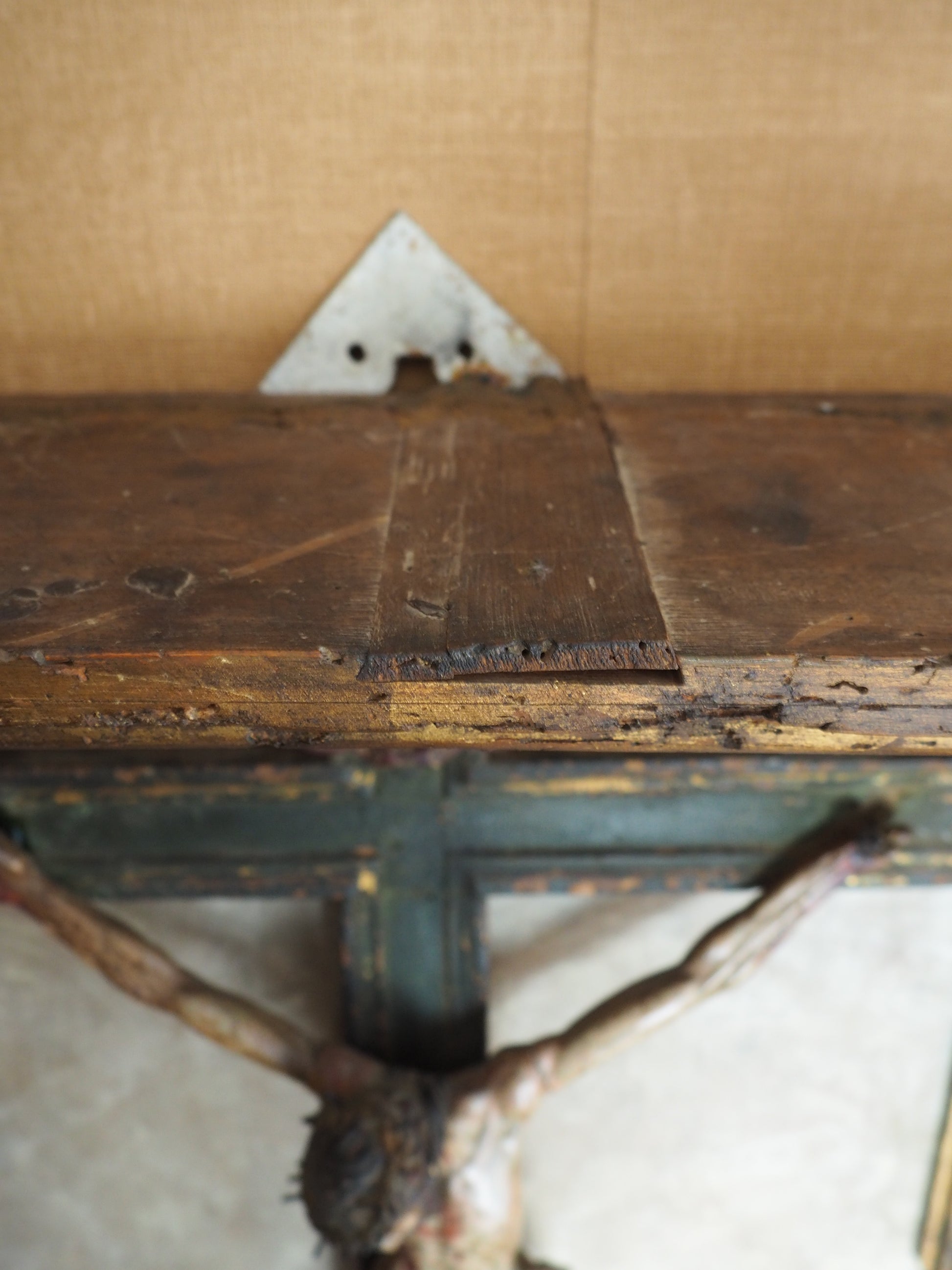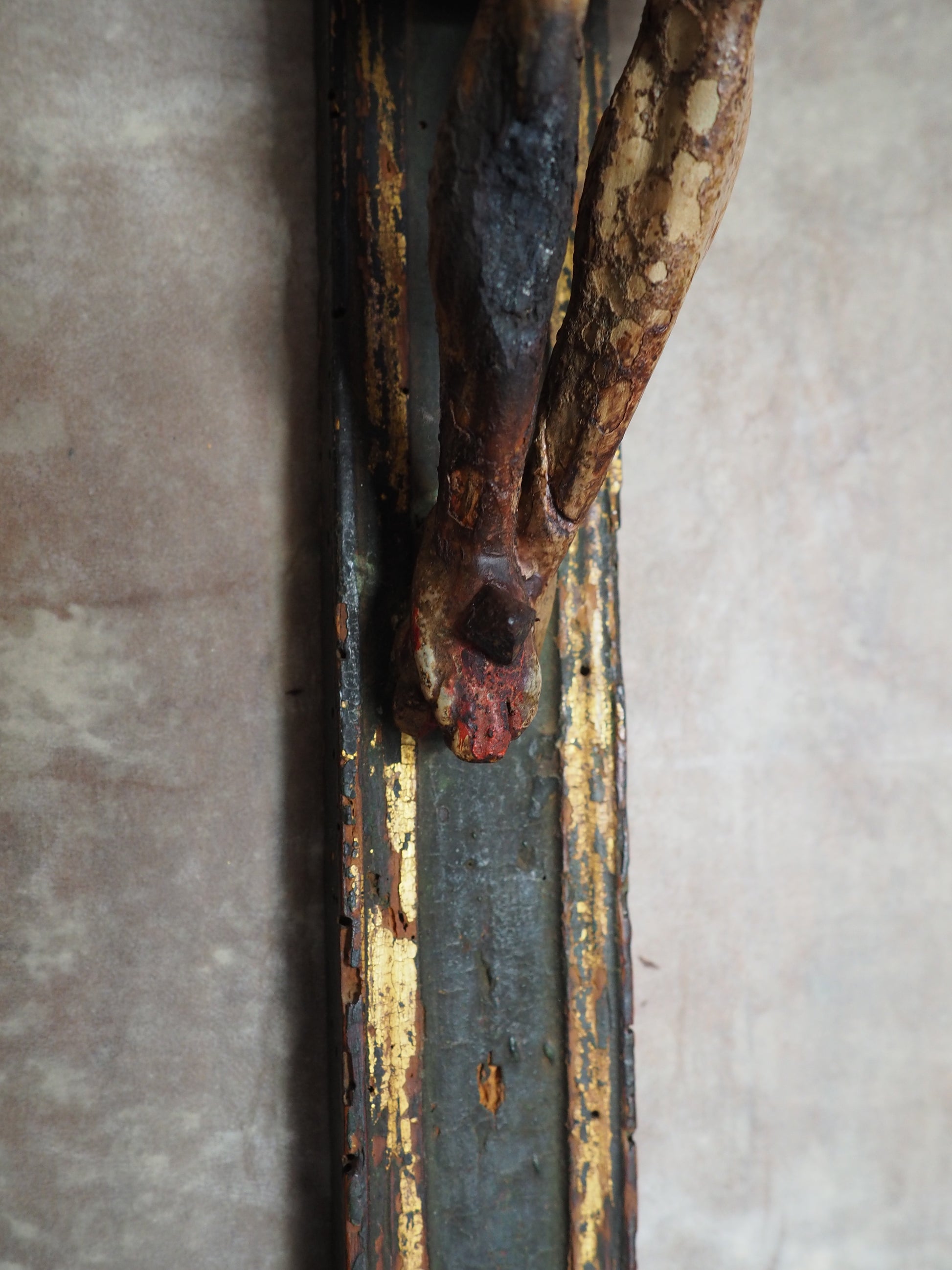 A striking and devotional Spanish Corpus Christi from the late 17th century, carved in wood and retaining its original polychromy, mounted on its period wooden cross and set within an original gilded niche. The work displays the characteristic emotional realism of the Iberian Baroque: a deeply modelled ribcage, expressive wounds, finely carved beard and the distinctive Spanish knotted perizonium.